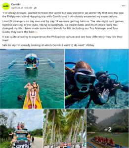 My last example illustrates best practice social media posting strategies using user-generated content. Contiki was a stand out because of its consistent use of this practice, appealing to its Millennials and Gen Z demographic. UGC creates value via first-hand travel experiences that align with their brand narrative of ‘shared adventure’ and ‘travel together’. It gave Contiki the edge over Lonely Planet and Nomadic Matt because user-generated content feels honest and builds trust. Their strategy uses all 3 three UGC forms e.g. written, visual and audio, that improves conversion rates and increases return traffic. They have a regular posting schedule, incorporate CTA’s that drives organic traffic, use questions to prompt conversation and hashtags to amplify reach – all combining to enhance rapport.